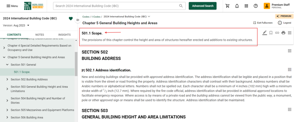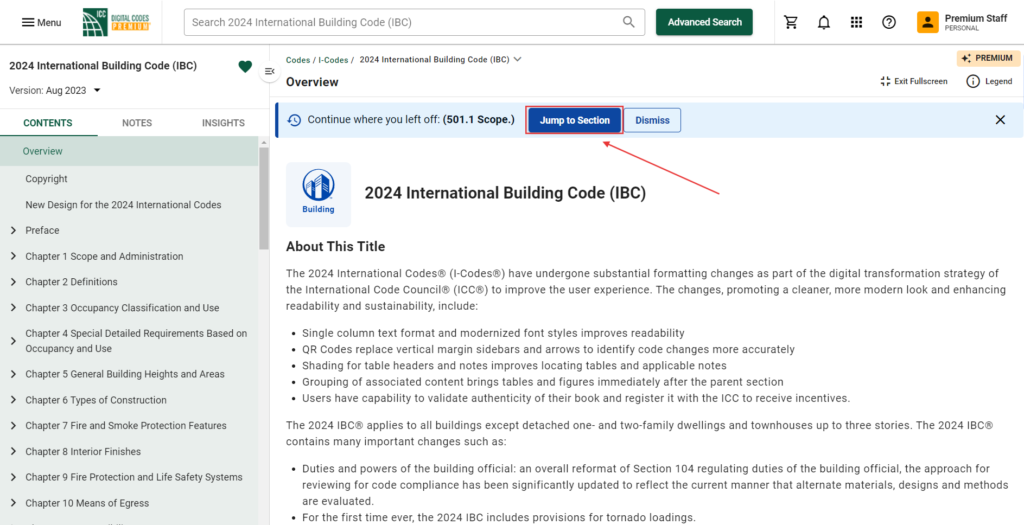 In the blue bar at the top of the code title, you will see the last section you viewed and the options to "Jump to Section" or "Dismiss". In the above example, we can see that the last section the user viewed in the 2024 International Building Code (IBC) was 501.1 Scope. By clicking "Jump to Section" the user will automatically return to this section, seen in the image below. By clicking "Dismiss", this will close the "Continue where you left off" box.